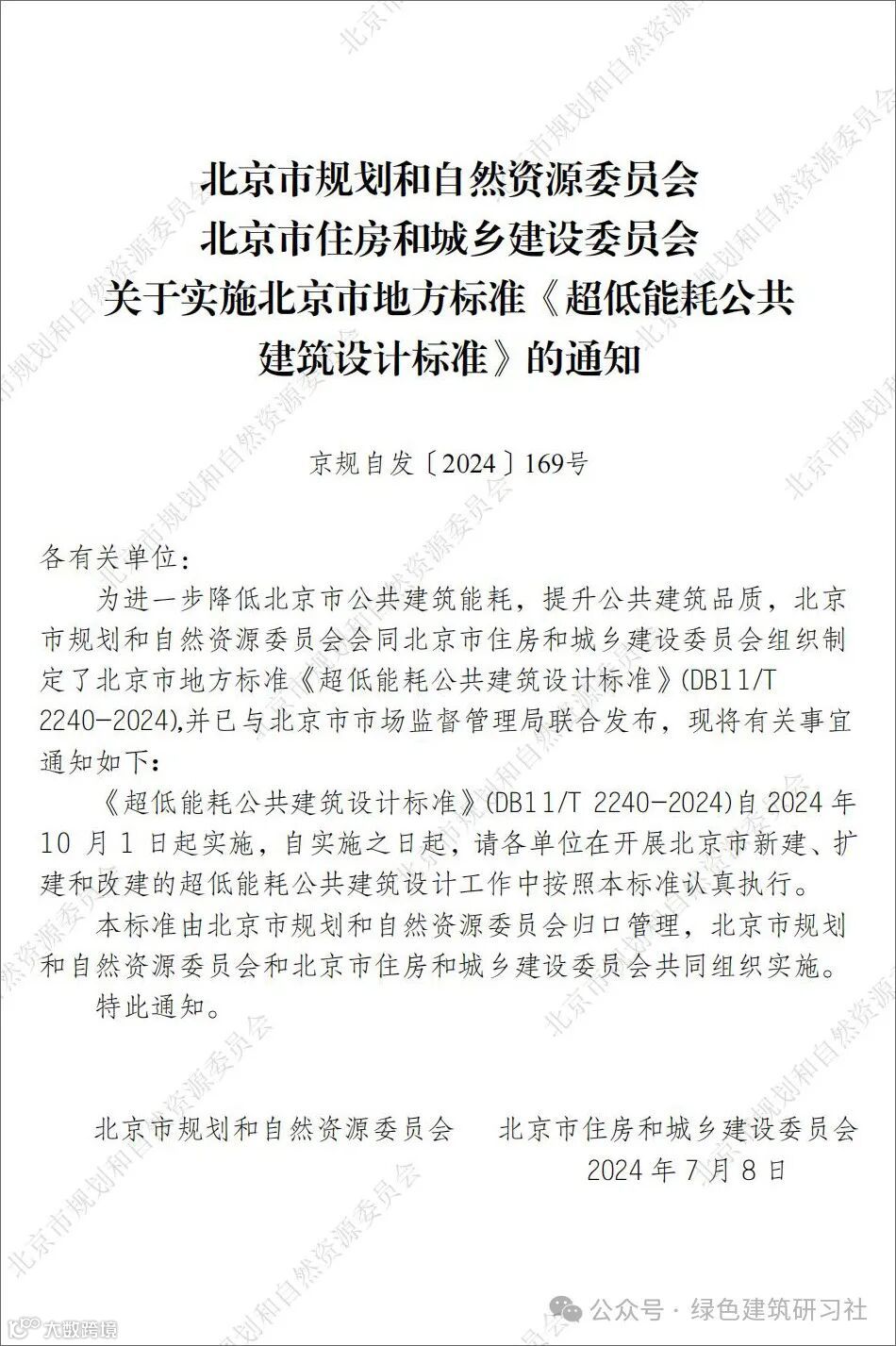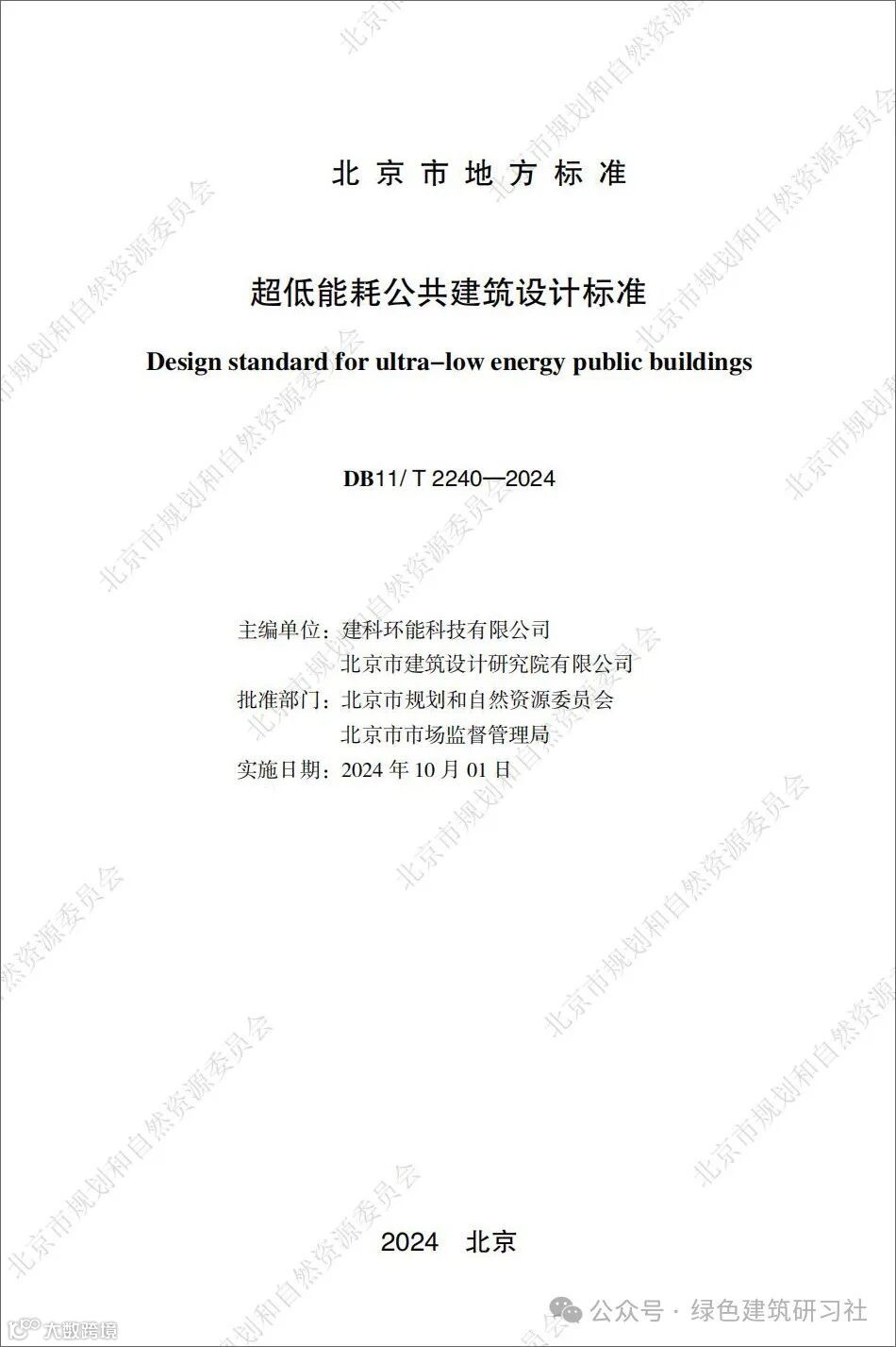 北京市地方标准《超低能耗公共建筑设计标准》(DB11/T2240-2024)将于2024年10月1日起实施,以下为标准全文: