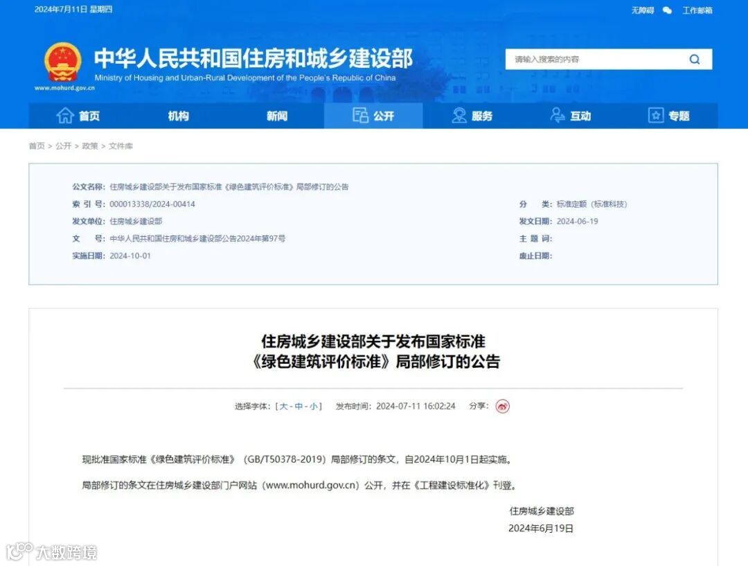 2024年6月19日住房城乡建设部关于发布国家标准《绿色建筑评价标准》局部修订的公告,批准国家标准《绿色建筑评价标准》(GB/T50378-2019)局部修订的条文,自2024年10月1日起实施。