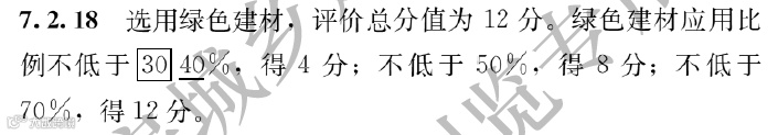 同时第7章资源节约的7.2.18条绿色建材应用比例得分要求,得4分的比例要求由不低于30%提高至不低于40%。
