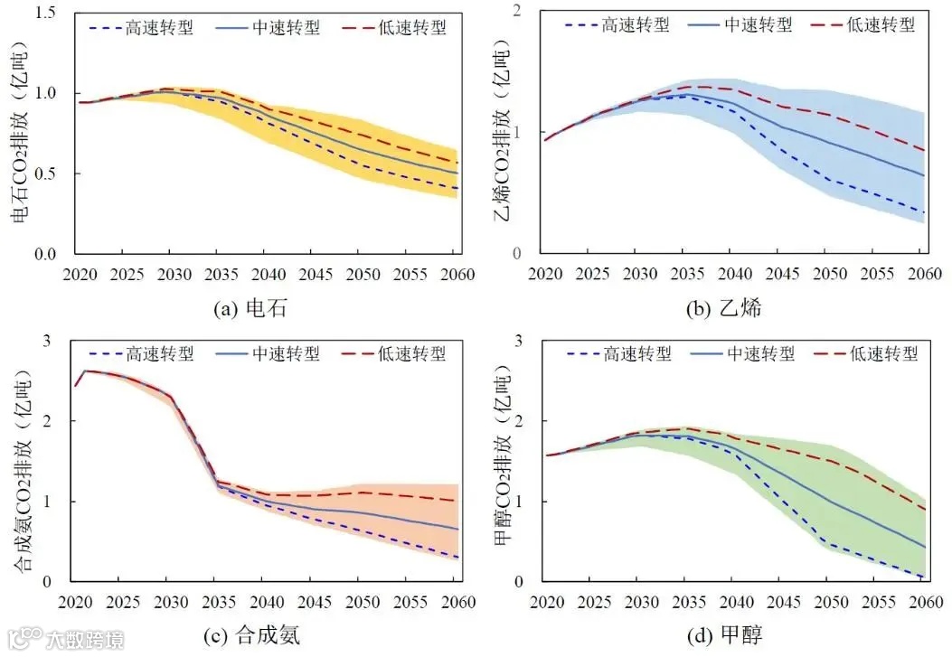 未来关键化工产品需求将持续增加,致使碳减排面临严峻挑战。在经济增长相对平稳的中需求情景下,2060年乙烯需求将达到6923万吨,而若经济增长速度更高和更低时,则其需求将分别为9617万吨和4880万吨左右。受未来产业结构中第一和第二产业占比逐渐下降影响,合成氨需求将总体呈现下降趋势,到2060年,在高、中、低需求情景下将分别下降至2900万吨、2419万吨和2054万吨。电石和甲醇作为重要的大宗基础化工品且位于产业链的上游,在经济发展和社会经济转型的双重作用下,其需求将呈现总量增长、增速放缓的趋势。2060年时,甲醇需求在0.985~1.32亿吨,电石需求为4745~6371万吨。