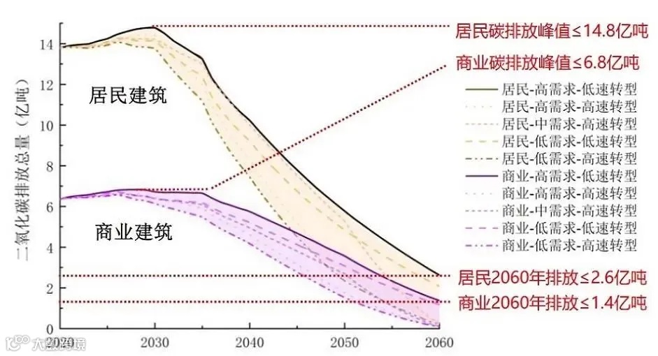 在满足能源服务需求的前提下,为了实现全国“双碳”目标,同时考虑现实资源约束、政策规划、技术进步等,建筑部门需加快推广清洁、高效设备,其中,高效供暖空调(国家标准一级能效)、高效制冷空调(国家标准一级能效)、热泵热水器、高效电炊具(热效率达90%)、高效LED灯(相对效率达白炽灯的14倍及以上)与其他高效电器分别提供居民建筑供暖、制冷、热水、炊事、照明和电器服务的92%、100%、90%、81%、68%和100%,高效供暖中央空调(国家标准一级能效)、高效制冷中央空调(国家标准一级能效)、高效热泵热水器(国家标准一级能效)、高效LED灯(相对效率达白炽灯的14倍)与其他高效电器分别提供商业建筑供暖、制冷、热水、照明和电器服务的64%、95%、92%、85%、85%。