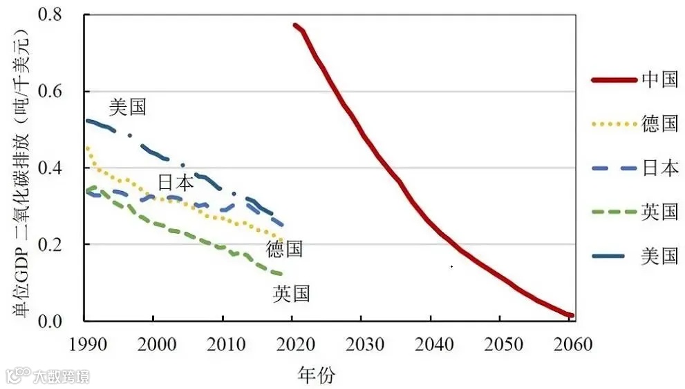 为实现“双碳”目标,中国单位GDP二氧化碳排放需快速下降。图3展示了中国与主要发达国家单位GDP二氧化碳排放量的对比情况。目前,中国单位GDP二氧化碳排放水平较高(2020年约为0.77吨/千美元),依照图3中提出的碳中和路径,中国单位GDP二氧化碳排放将于2040—2050年间降至与主要发达国家当前水平相当;2060年中国单位GDP二氧化碳排放仅为2020年的2%左右,全社会整体将进入低碳发展模式,2020—2060年单位GDP二氧化碳排放年均下降速度需达到9%以上。