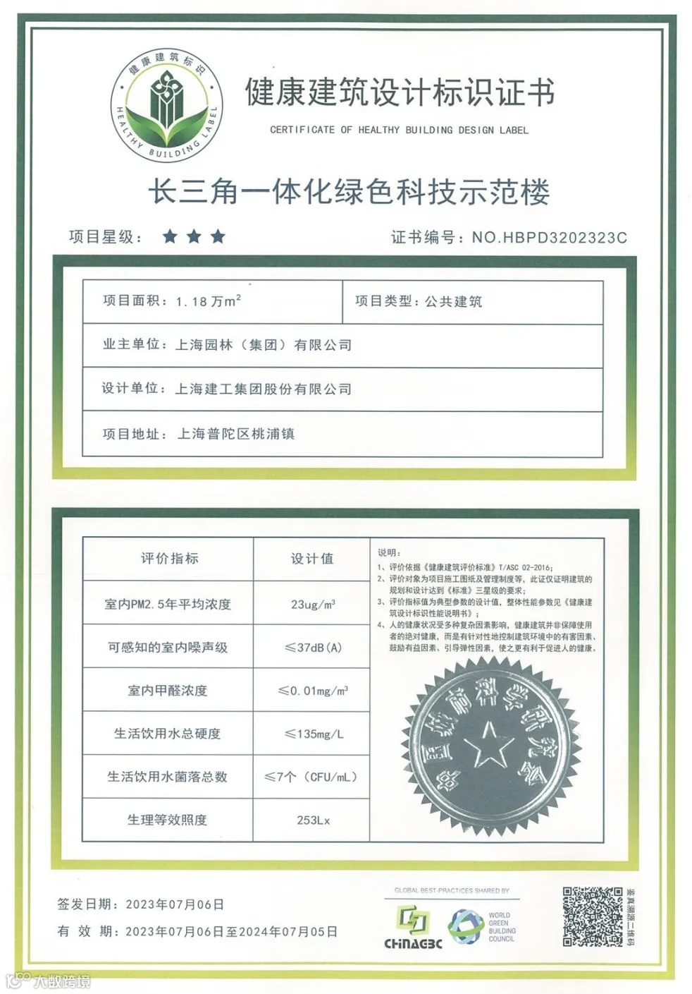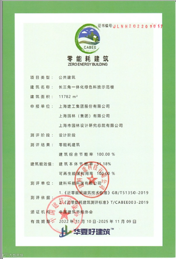 本项目通过绿色创新技术的研发以及成熟绿色技术的集成应用,确保项目建成后达到全生命周期碳中和、建筑运营净零能耗、建筑运营极致节水、高品质室内空气环境。在中国建筑节能协会公布的2022年第三批近零能耗建筑测评结果中,长三角一体化绿色科技示范楼被测评为零能耗建筑。