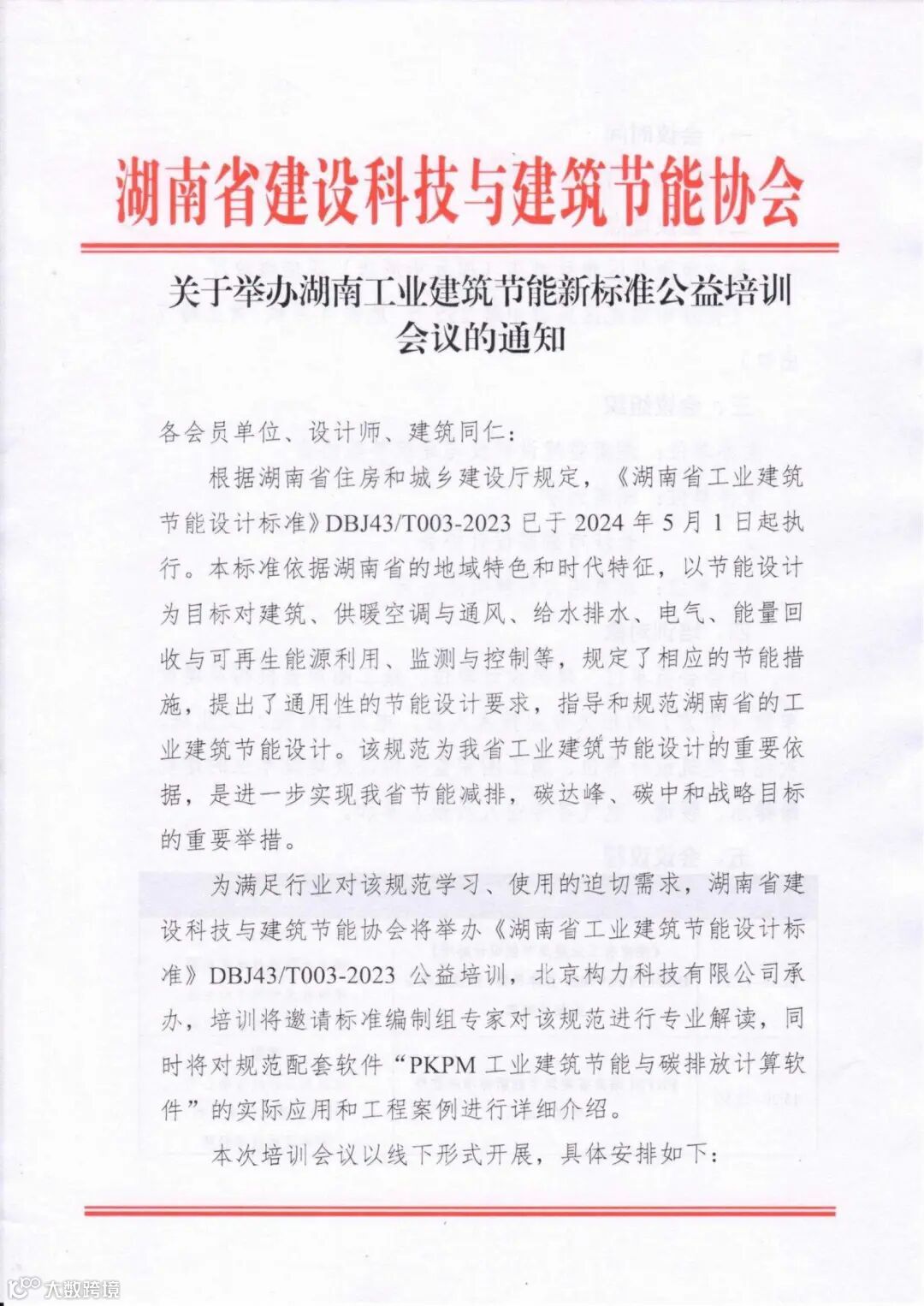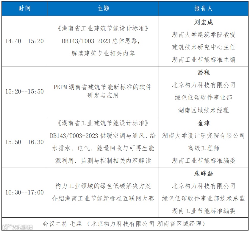 为满足行业对该规范学习、使用的迫切需求,湖南省建设科技与建筑节能协会将举办《湖南省工业建筑节能设计标准》DBJ43/T003-2023公益培训,北京构力科技有限公司承办,培训将邀请标准编制组专家对该规范进行专业解读,同时将对规范配套软件“PKPM工业建筑节能与碳排放计算软件”的实际应用和工程案例进行详细介绍。