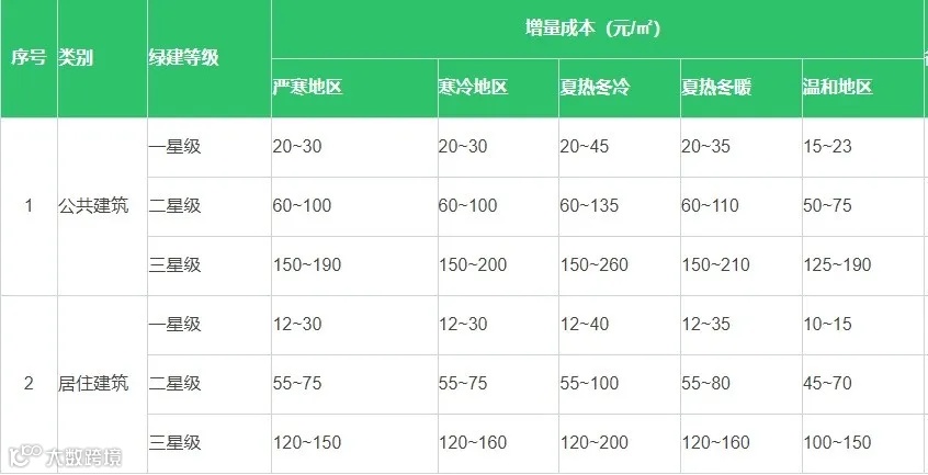 绿色建筑工程增量成本综合参考指标