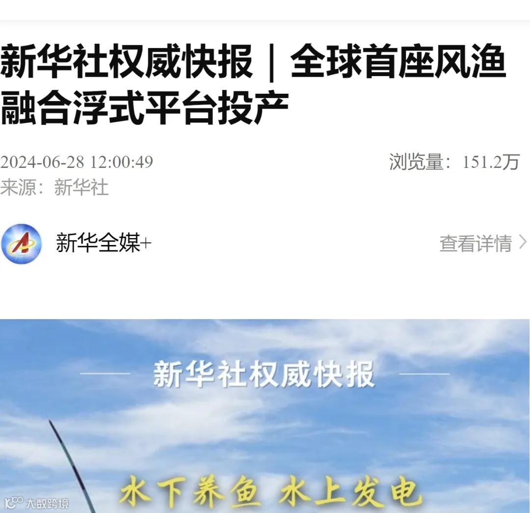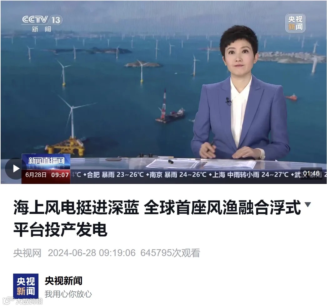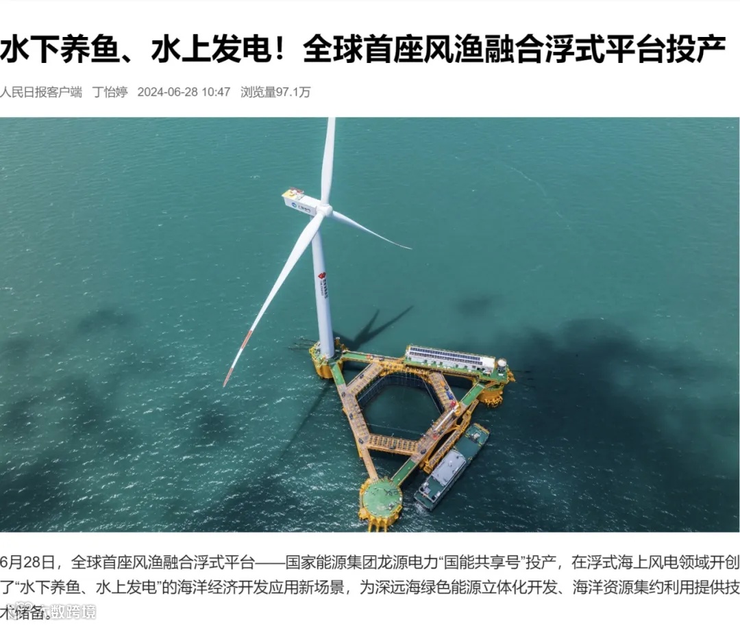 6月28日,全球首座风渔融合浮式平台——国家能源集团龙源电力“国能共享号”投产发电,项目首次实现了“浮式风电+深海养殖”的海洋经济开发应用新场景,为打造“绿色能源”和“蓝色粮仓”的融合发展提供了新样板,形成以风渔互补的高科技、高效能、高质量的新质生产力,引领风电开发迈入深远海。