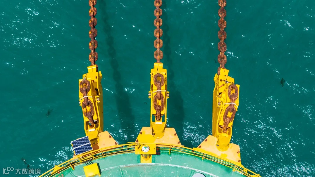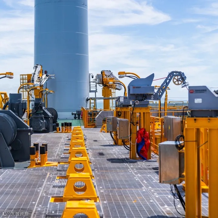 先进技术►首次在漂浮式风电领域应用船体端部连接张紧器,集导向、止链、张紧功能于一体,大幅提高海上锚链回接效率。