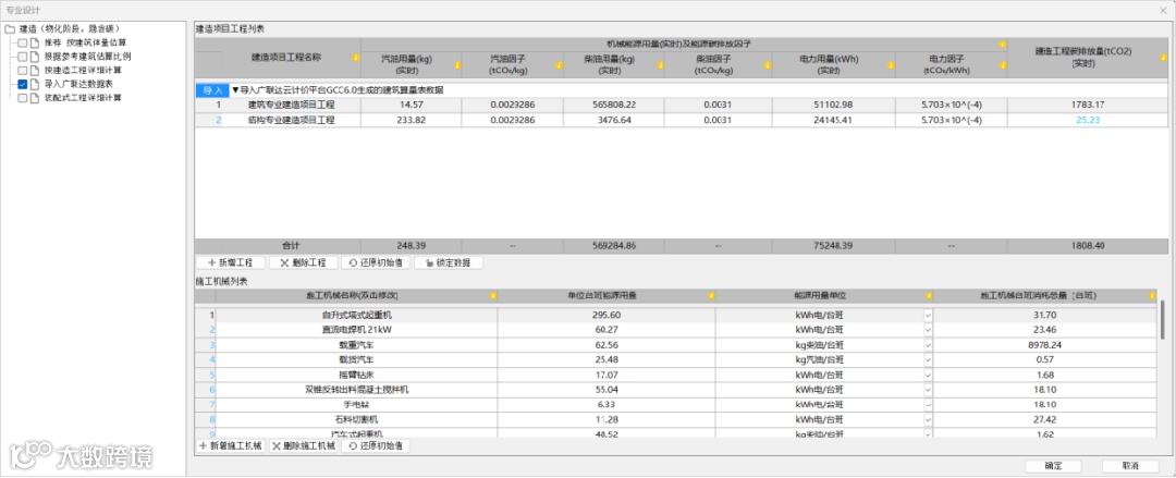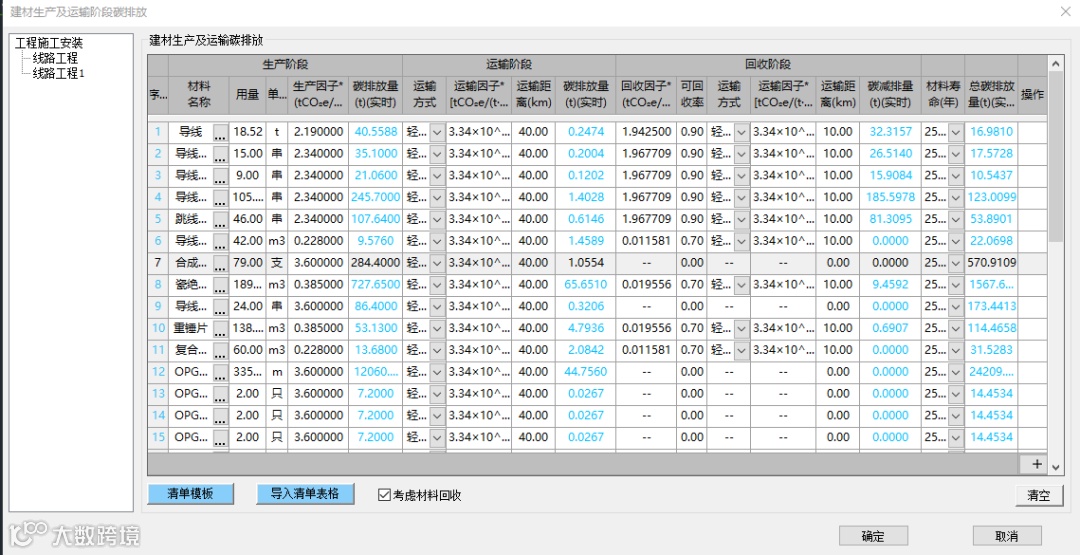 (2)输电线路建材统计支持工程材料表、算量表自动导入与识别,匹配碳排放因子