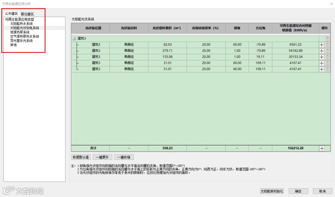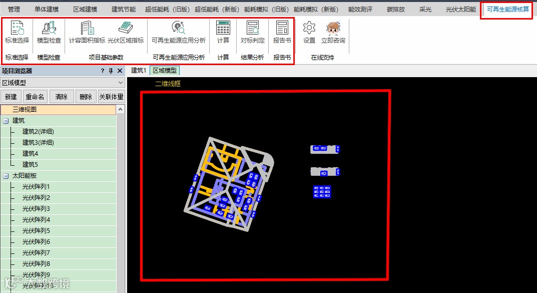 区域建模编辑模型,根据计容面积指标及光伏指标等进行可再生能源的应用计算