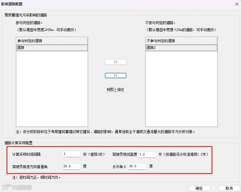 进行幕墙反射光对道路影响分析时增加驾驶员视线高度设置,默认为驾驶时人眼高度1.2米,也可按需修改。