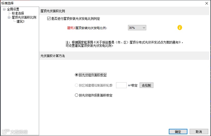 3)针对国家能源局,关于报送整县(市、区)屋顶分布式光伏开发试点方案的通知,可以在面积比例判定界面设置屋顶安装光伏发电的比例。