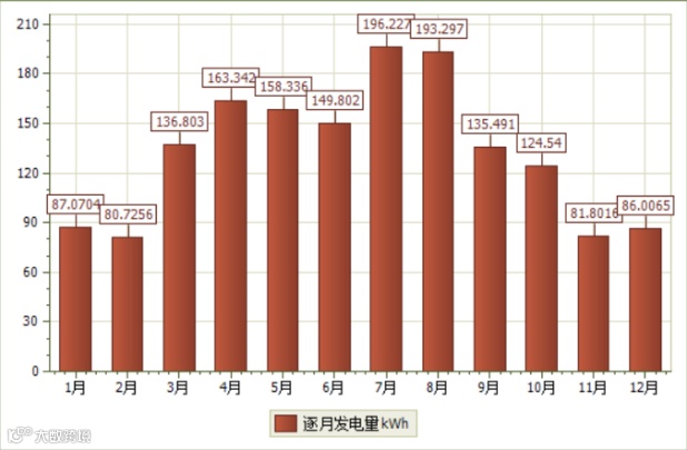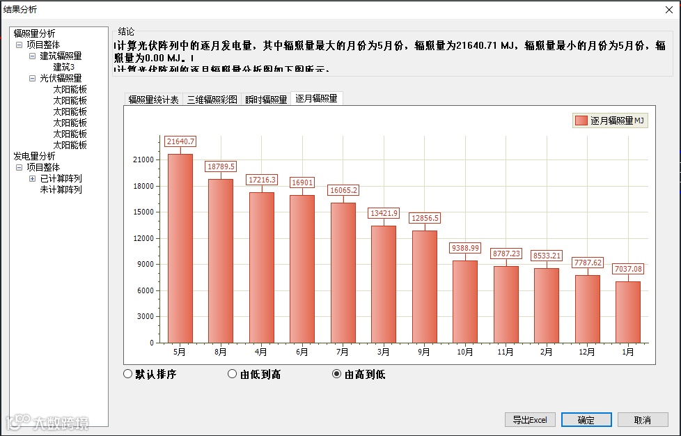 5)结果分析中辐照量统计结果展示辐照量统计表、三维辐照彩图、瞬时辐照量、逐月辐照量等在内的结果展示,结果展示可以输出发电量统计表、逐年发电量统计表、逐月发电量统计。
