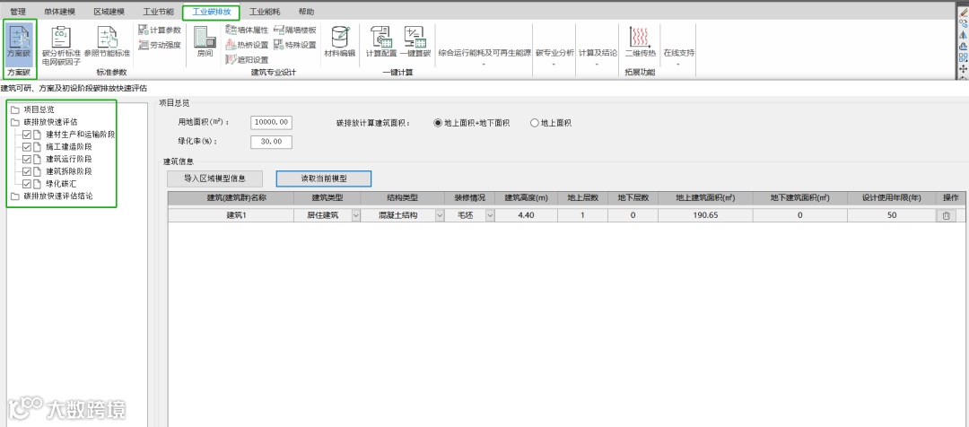 方案碳功能内嵌于民用建筑、工业建筑碳排放中,其继续秉承PKPM简单操作的理念,三大步完成初设、方案阶段的碳排放快速估算,即项目总览设置—快速评估—快速评估结论查看。方案碳满足了设计初期无需模型,即可对项目年度碳排放总量、主要产品碳排放强度进行预测与核算,便于提出项目碳排放控制方案,明确拟采取减少碳排放的路径与方式。