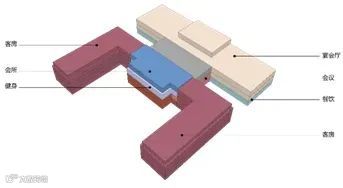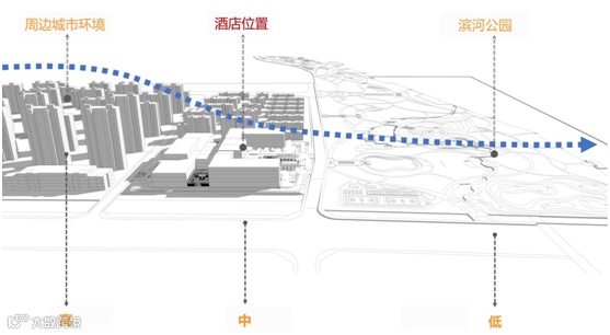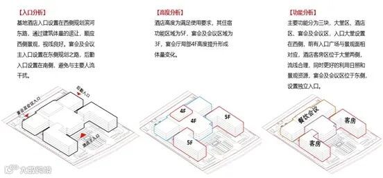 在平面布局中,酒店大堂正对西侧景观,南北两侧为高端被动式客房区,将客房布置在靠近滨河公园一侧,最大限度为客房提供最优美的景观视野,将景观资源利用最大化;东侧为餐饮、会议宴会区,东西两区通过中心的内部庭院相连,使得两大功能区既能保持独立,又有紧密联系。