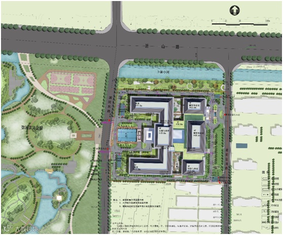 整体功能布局合理、灵活,联系性强,交通流线便捷高效。建筑布局借助弥河优美的景观优势,延续滨河开敞的空间特色,建筑内部穿插多个庭院,组织围合式的建筑空间群落,形成能延续临朐传统文化特色的建筑空间。