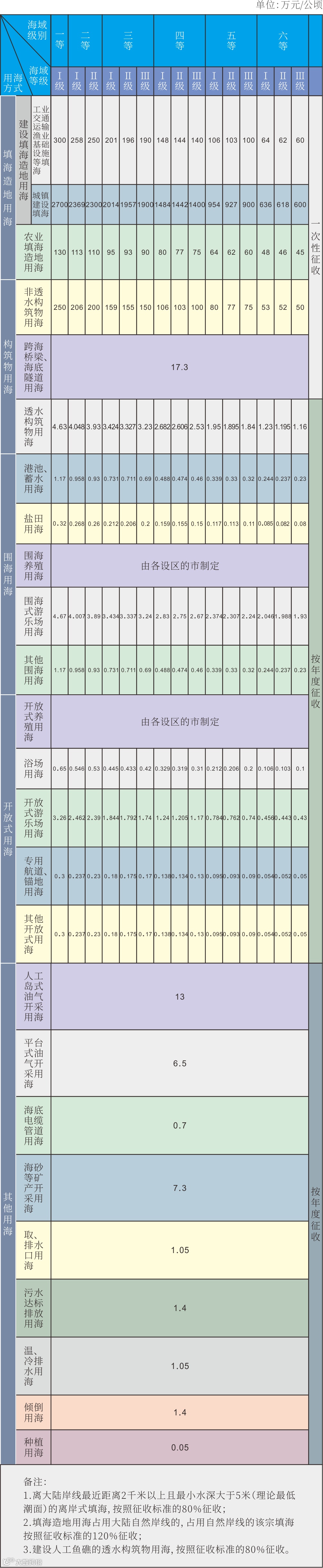 本文依《山东省海域使用金征收标准》为例进行说明,山东省海域级别及海域使用金征收标准如下: