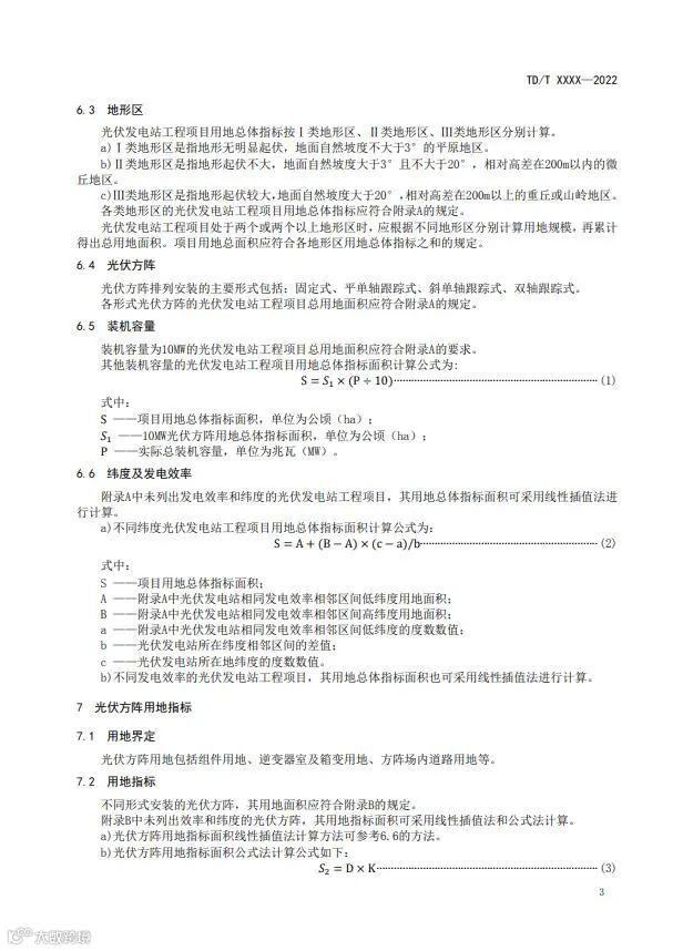 文件指出:光伏发电站工程项目用地总体指标按Ⅰ类地形区、Ⅱ类地形区、Ⅲ类地形区分别计算。光伏发电站工程项目处于两个或两个以上地形区时,应根据不同地形区分别计算用地规模,再累计得出总用地面积。项目用地总面积应符合各地形区用地总体指标之和的规定。