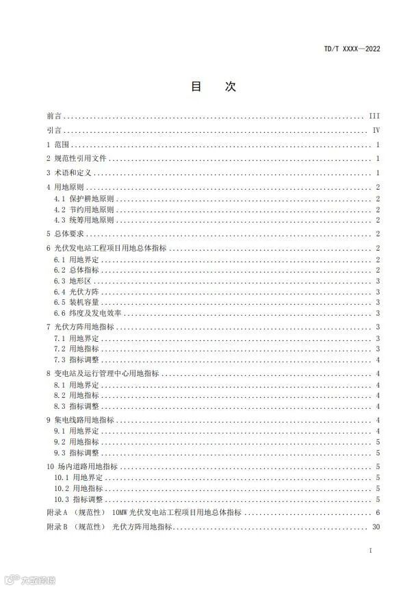 总体要求,光伏发电站工程项目用地指标分为总体指标和各功能区用地分项指标。光伏发电站工程项目建设应符合本文件确定的用地总体指标和各功能区用地分项指标。采用总体指标时,光伏发电站工程项目总用地规模按照第6章的规定执行;采用分项指标时,光伏发电站工程项目用地规模按照第7章、第8章、第9章及第10章的规定执行。