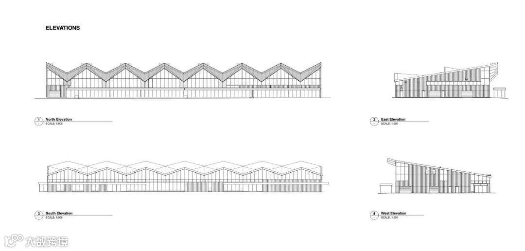 沿着北立面,雪佛兰形的外部檐篷具有多重好处;它们充当大房间,排出从下面的太阳能烟囱吸入的暖空气,同时也为室内提供遮阳,减少北立面的玻璃范围。