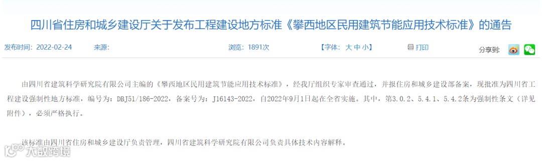 四川省住房和城乡建设厅于2022年2月24日发布了由四川省建筑科学研究院有限公司主编的《攀西地区民用建筑节能应用技术标准》(编号为:DBJ51/186-2022,以下简称《标准》),该《标准》已于9月1日起在四川省实施。