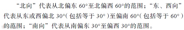 关于朝向划分,《标准》在5.4.1条文说明里面提到了建筑立面朝向划分,此朝向划分沿用了《四川省公共建筑节能设计标准》(DBJ51/143-2020)第3.1.6条的规定,如图1所示;此立面朝向划分与《通用规范》附录B中B.0.5条中立面朝向划分不一致(如图2所示)。