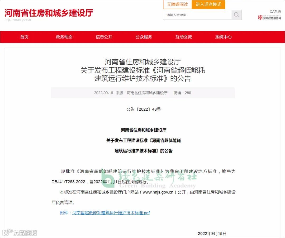 现批准《河南省超低能耗建筑运行维护技术标准》为我省工程建设地方标准,编号为DBJ41/T268-2022,自2022年11月1日起在我省施行。