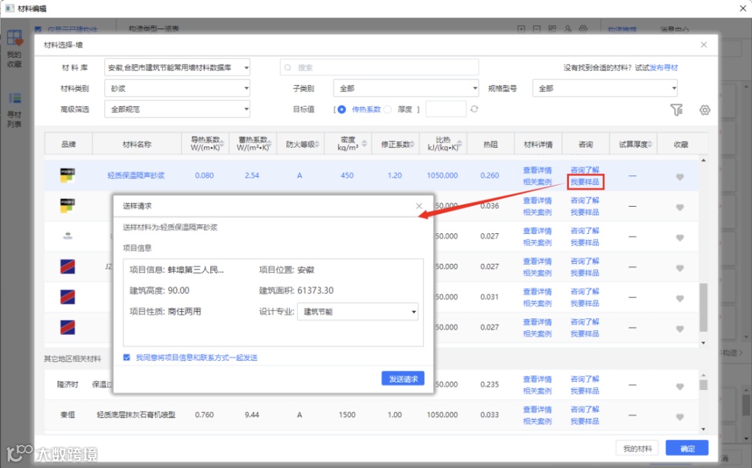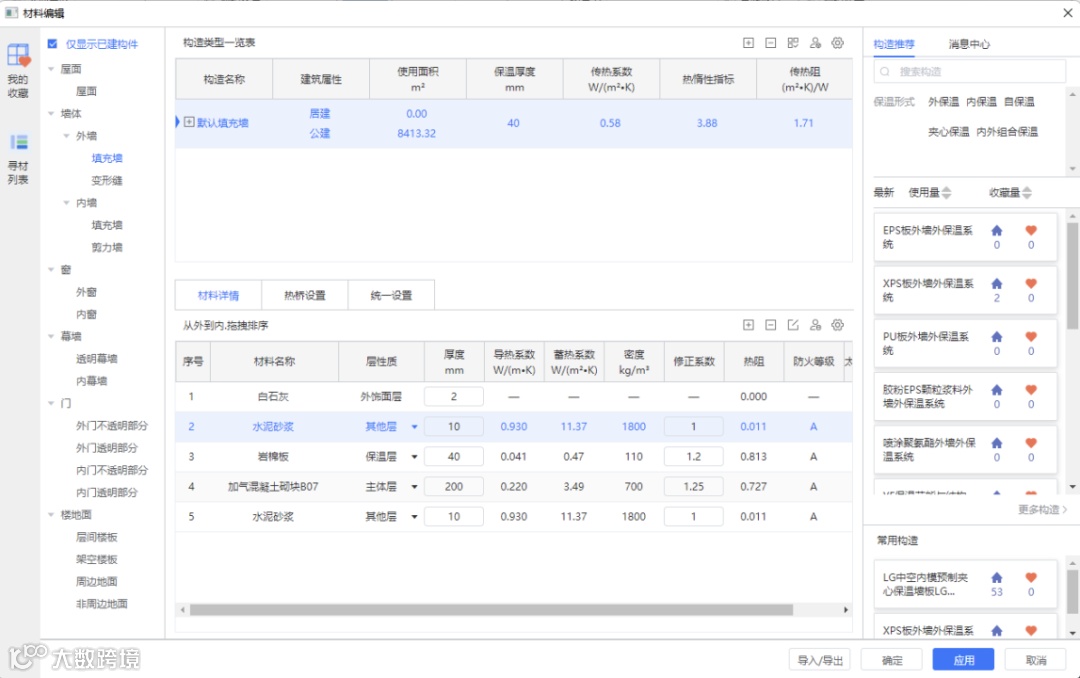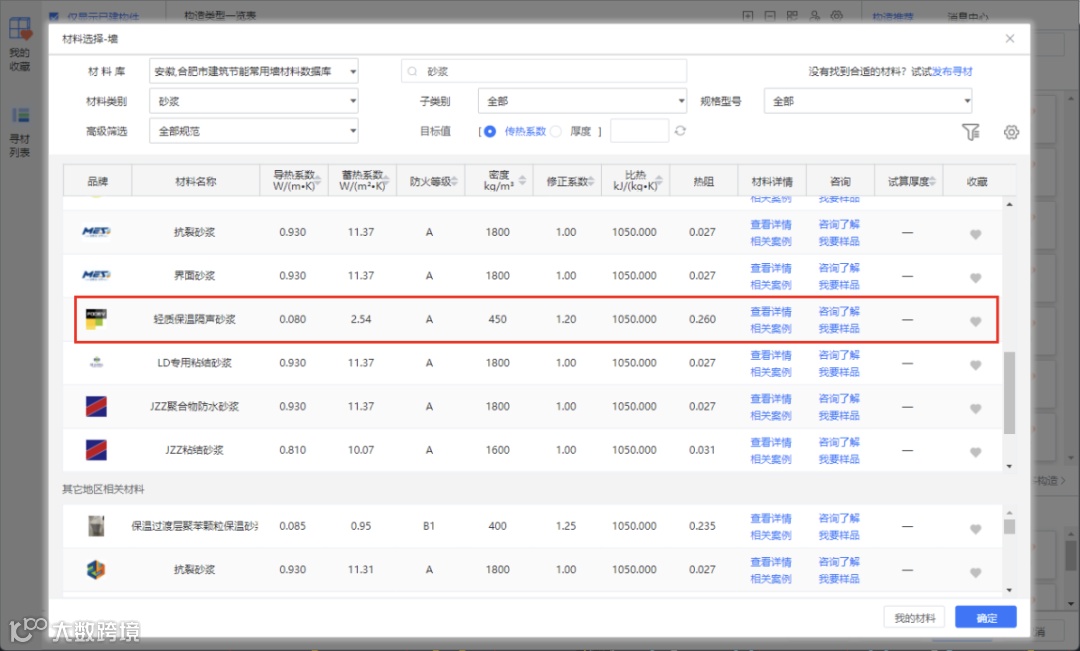 若想查看每一层材料的参数及案例,即可点击该层材料进行查看。材料详情界面可以查看到不同类别下材料的热工参数,也支持传热系数与厚度的试算,界面如下: