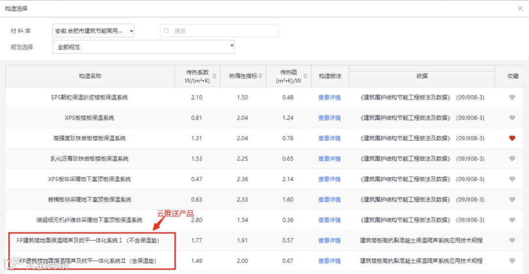 第四步:在右侧的构造推荐可看到被推送出来的“FP建筑楼地面保温隔声及找平一体化系统”,可双击进行选用