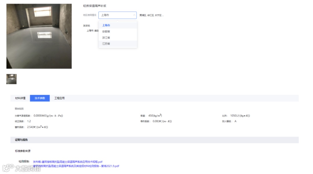 点击查看详情或者相关案例即可跳转至绿材在线界面,查看材料详情、技术参数及标准参数来源。