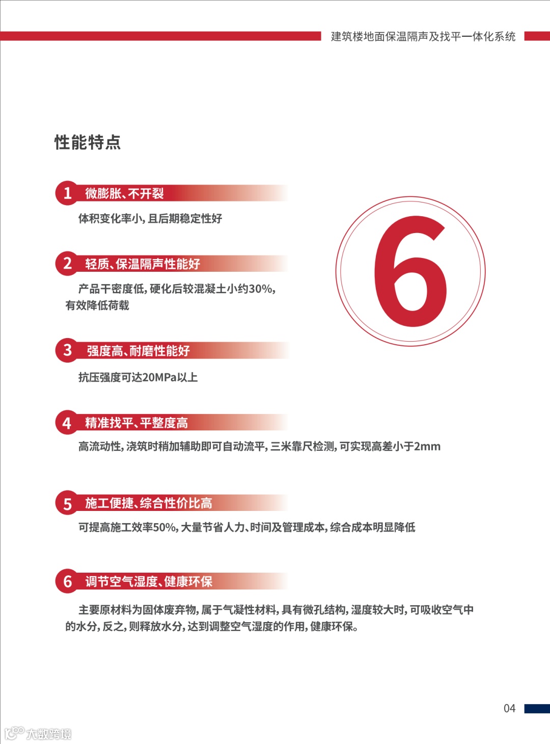 1)干密度低,整体重量轻保温隔声性能好、防火等级高;2)明显改善居住舒适感;3)材料直接成本低;4)材料间接成本可节约50%左右(流动度大、施工简单、工期可缩短40-60%并可提前拆除脚手架等);5)不开裂;6)面层平整度高;7)施工工程中可自助流平或稍加辅助摊铺后可自动流平,施工方式简单,可节省劳动力及施工时间,平整度高,可直接在地坪上铺设饰面层(地毯、木地板、瓷砖等)