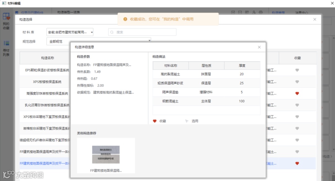 单击可查看该构造的构造详细信息和组成材料,可以对该构造进行收藏和选用。