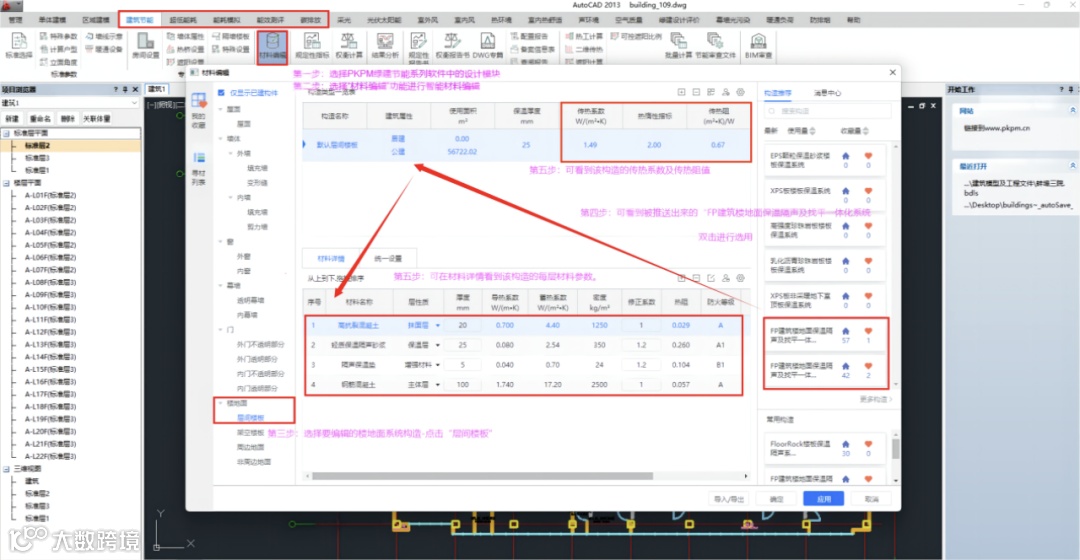 【功能介绍】:PKPM绿色低碳系列软件2023版的智能材料编辑界面中,方案选型更加简单,拥有全新的围护结构设计体验。系统会根据项目所在地智能匹配适用的系统构造及材料,常用的方案可存储在个人账号,软件提供超低能耗、标准图集等构造体系,方便用户选择更加即时、合规、绿色的建材。