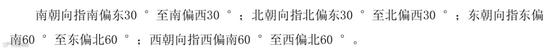 建筑朝向:南朝向指南偏东30° (含)至南偏西30°(含);北朝向指北偏东30°(含)至北偏西30°(含);东朝向指东偏南60°至东偏北60°;西朝向指西偏南60 °至西偏北60 °---与2013版划分一致。