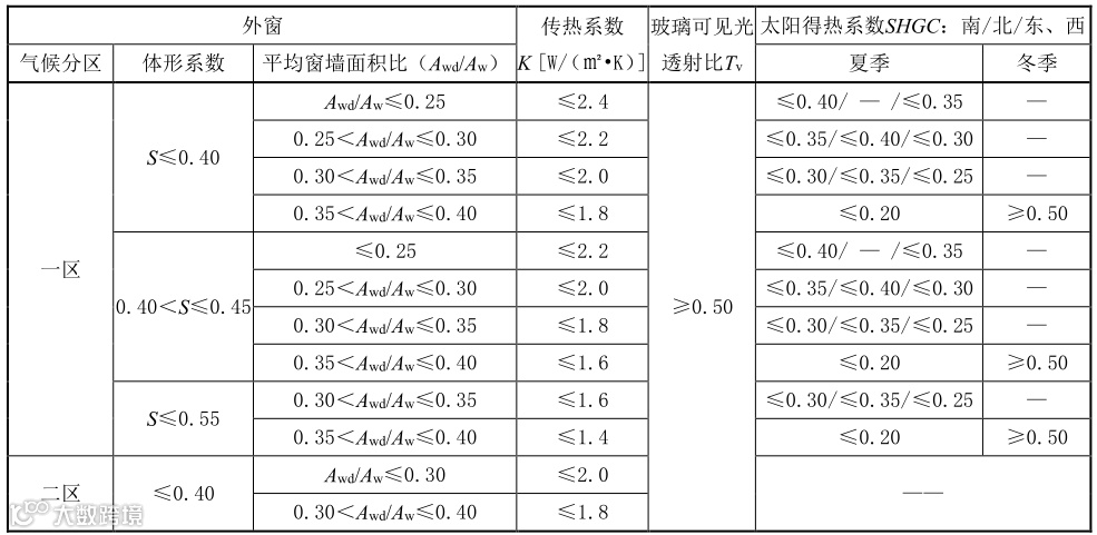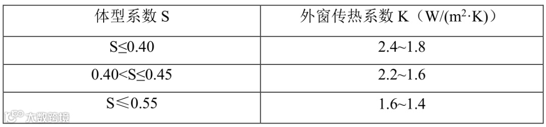 3)外窗传热系数按体形系数划分,体型系数越小,对外窗传热系数越宽松,体型系数优化非常重要;