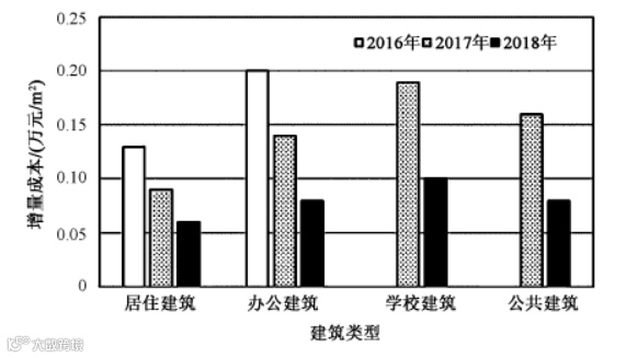 居住建筑由于技术和市场逐渐成熟,增量成本从1300元/m2,降至600元/m2,降幅达 53. 8% ,办公建筑增量成本从1620元/m2,降至800元/m2,降幅50. 6%,学校类建筑增量成本主要集中在围护结构和空调新风系统方面,增量成本从1540元/m2,降至1000元/m2,降幅35. 1%