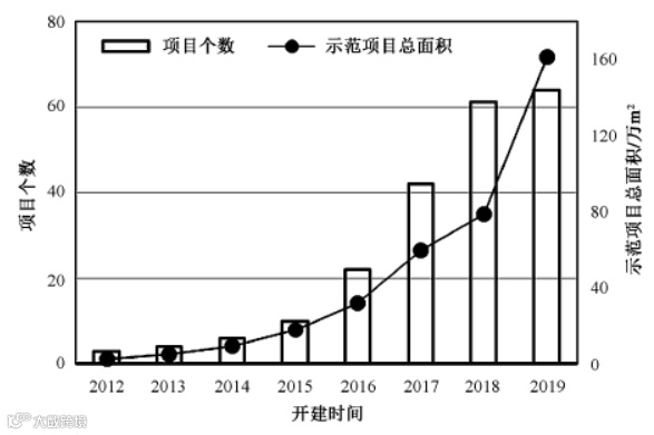 2015年之前项目数量较少,总面积仅为4.7万m2,2015~2016年期间示范项目数量开始呈快速增长态势,至2018年底,收集示范项目面积超过160万m2。