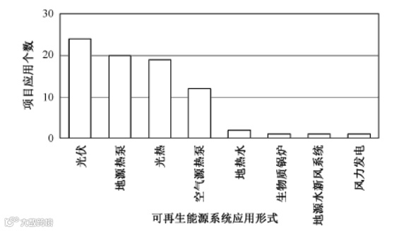 可再生能源以太阳能及热泵系统为主。目前居住建筑可再生能源提供量占建筑年能耗的 10%~25%,供能主要集中于冬季采暖和生活热水;办公建筑可再生能源提供量占比较高,占35%~55%。