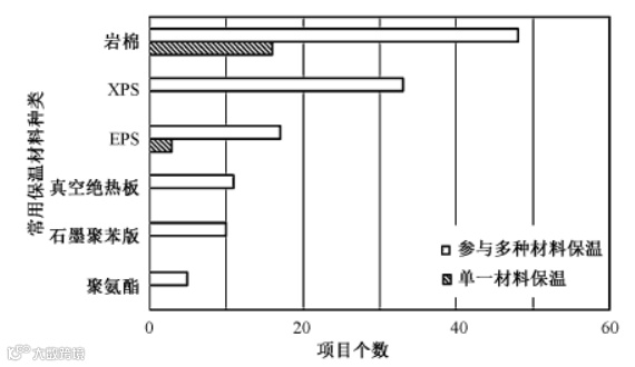 值得一提的是,随着超低能耗建筑体量日益增大,功能日益复杂,同一项目通常会采用多种保温材料,根据对 64 个示范项目的研究统计,有 45 个示范项目根据建筑不同构造采用多种保温材料构建建筑整体保温系统。