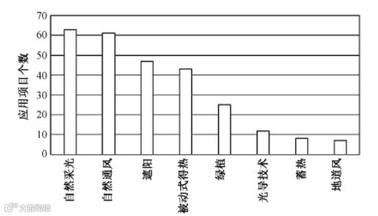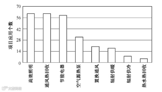 63个项目强化了自然采光设计,61个示范项目在建筑设计阶段注意协调和利用自然通风降低冷热负荷;47个示范项目采用建筑外遮阳和中置遮阳;部分示范项目通过采用大面积生态绿植避免等方式调节室内温湿度,营造舒适的室内声场环境,目前绿植环境优化技术主要应用在公共建筑中。
