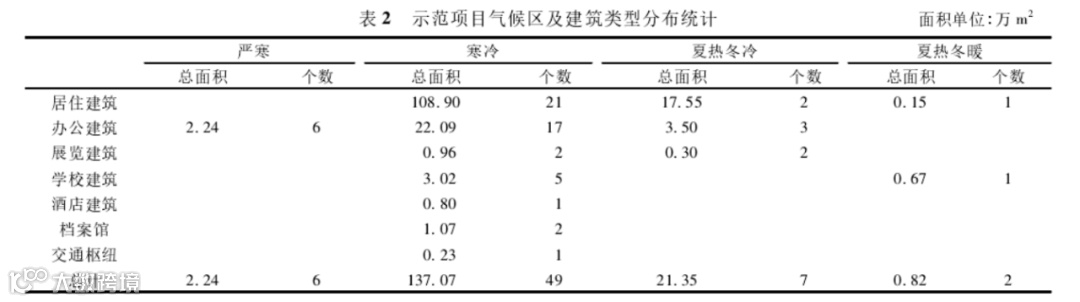 项目主要分布在寒冷地区,因为河北、山东、河南三个省份的政策推动。64个示范项目中居住建筑和办公建筑总面积为154. 43万m2,占示范项目总面积的96. 1%