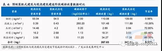 综合来看,其中钢材部分装配式住宅略有节省,但优势不大,节省率仅为0.98%。混凝土部分,装配式建筑用量高于传统现浇。木材、砂浆及保温材料装配式建筑在节约碳排放方面的优势较大,节省率分别达到70.95%、83.46%及49.35%。总体而言,预制装配式建筑在建造阶段碳排放量相较于传统现浇住宅节省率达到9.33%。