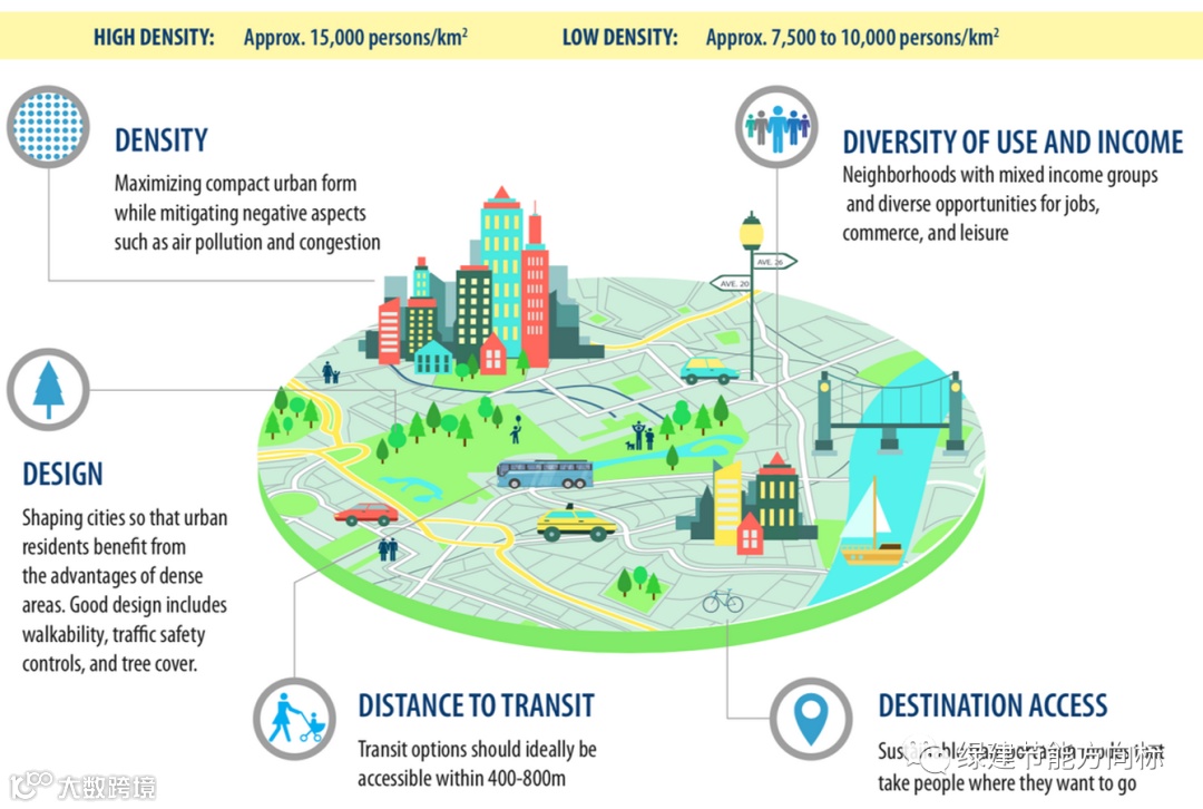 紧凑型城市:更节能、更少通勤、更多互动、社区精神、异质分区、更少对汽车的依赖。 -