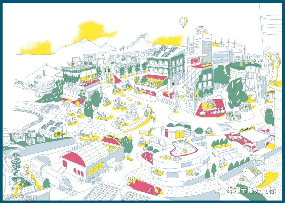 生态城市:自给自足的当地社区、可再生能源的使用、最低投入(资源)和产出(废物)、城市环境系统、当地获得的资源、零废物系统、碳中和、公共交通、城市和当地农业, 等等。 -