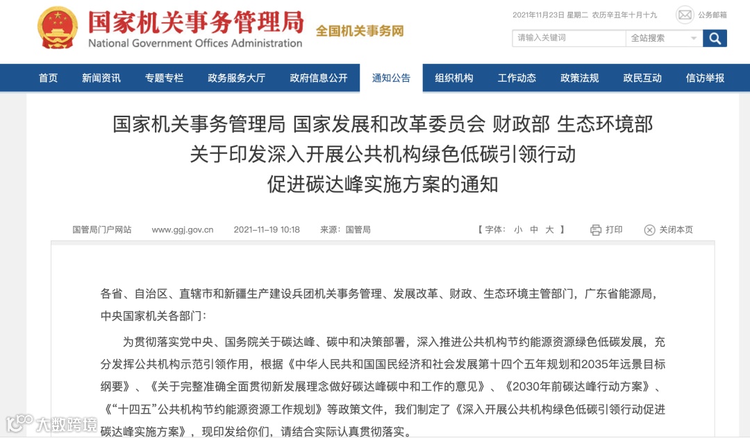 导读:近日,国管局、国家发展改革委、财政部、生态环境部印发了《深入开展公共机构绿色低碳引领行动促进碳达峰实施方案》