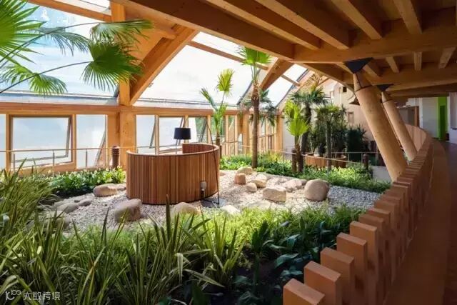 单纯在视觉上每层平面已经被设计的非常绿色环保,从选址,结构和材料的选择,以及景观设计和土木工程都设定有一系列的策越举措。从可持续环保考虑,采用弧度的木框结构和木质包裹成为建造规格上的主要因素,并且考虑的非常周到地整合联系到了基地周围植被成熟的风景区。