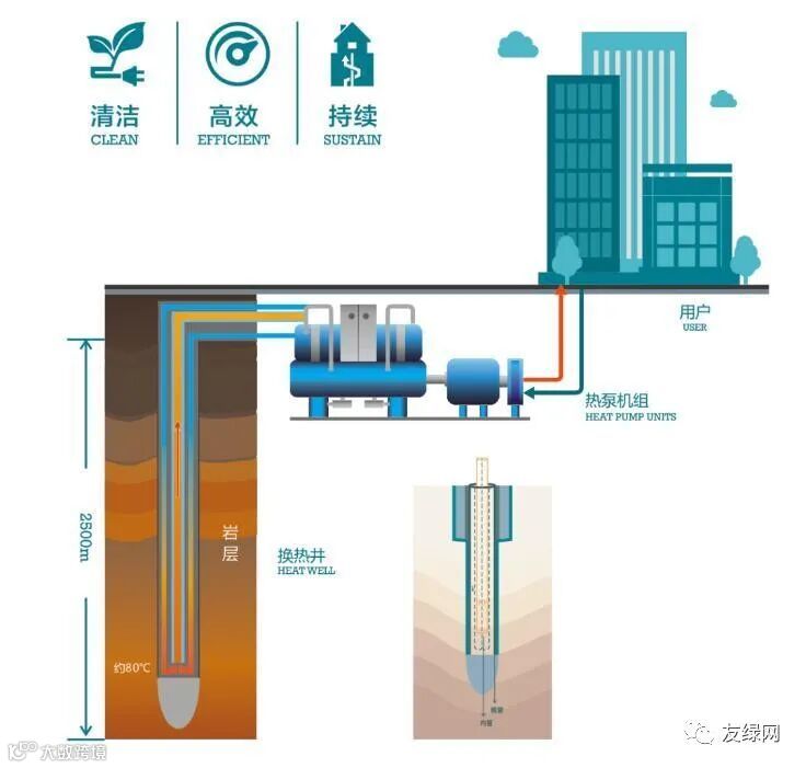 中深层地热能无干扰清洁供热技术通过向地下2000-3000m深处钻孔取热,运用地热能梯级利用与智能控制技术,解决游泳中心42%冬季辐射供暖、80%生活热水、100%泳池池水加热三大系统热源问题,实现供暖和热水系统低碳目标。