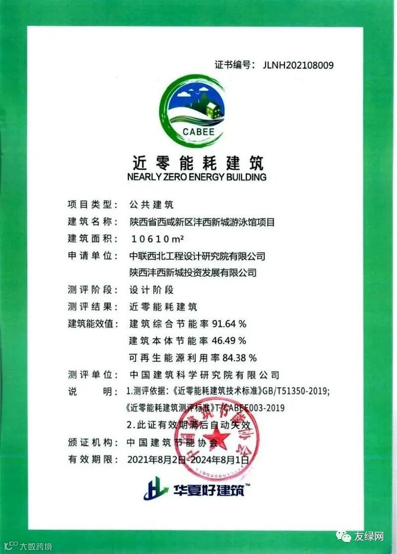 近日,西咸新区沣西新城游泳馆项目,获设计阶段“近零能耗建筑”证书,标志着全国首个AAA级装配式近零能耗游泳馆,在沣西新城建成。这也是沣西新城践行绿色发展理念积极探索“碳达峰碳中和”实现路径又一力作。