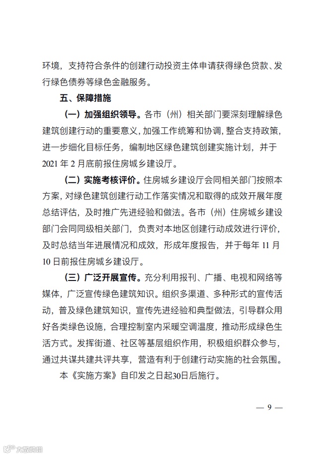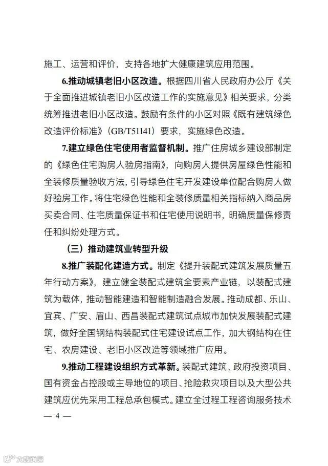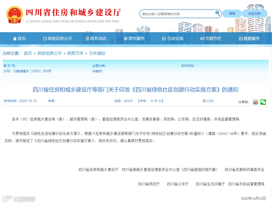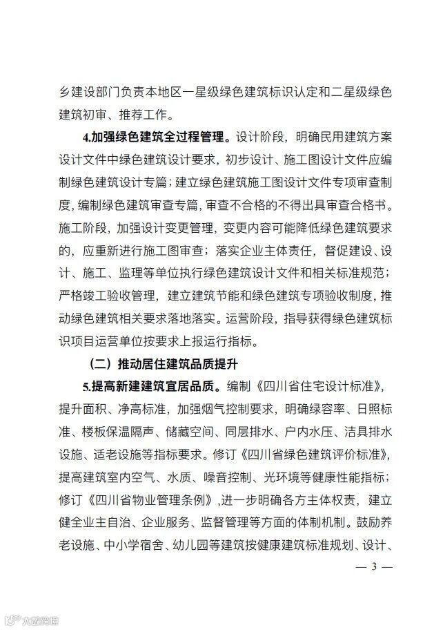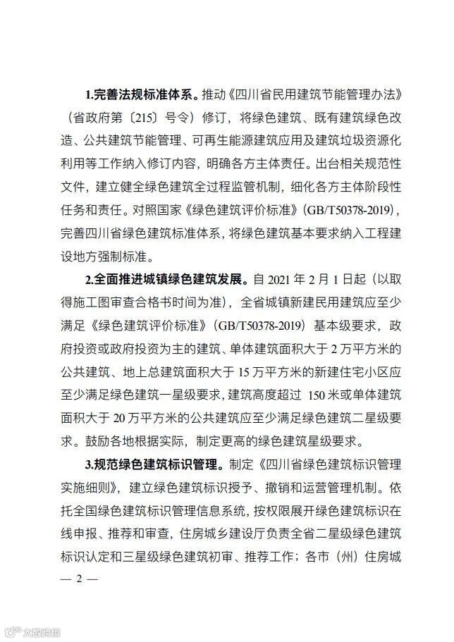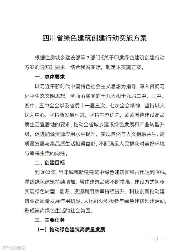 日前, 四川省住房和城乡建设厅等9部门联合印发了《关于印发四川省绿色建筑创建行动实施方案的通知》(川建行规〔2020〕17号)。方案中提到,自2021年2月1日起(以取得施工图审查合格书时间为准),全省城镇新建民用建筑应至少满足《绿色建筑评价标准》(GB/T50378-2019)基本级要求。全文如下: