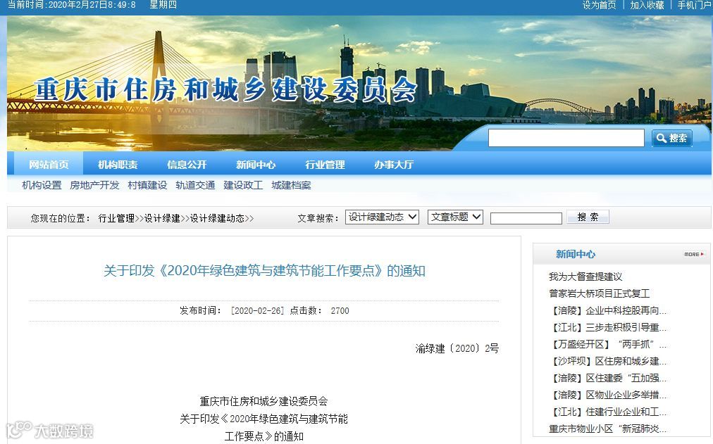 2020年2月25日,重庆市住房和城乡建设委员会印发《2020年绿色建筑与建筑节能工作要点》,并提出:“鼓励主城区范围内新建民用建筑执行更高节能标准,积极培育条件适宜的超低能耗和近零能耗示范项目。”