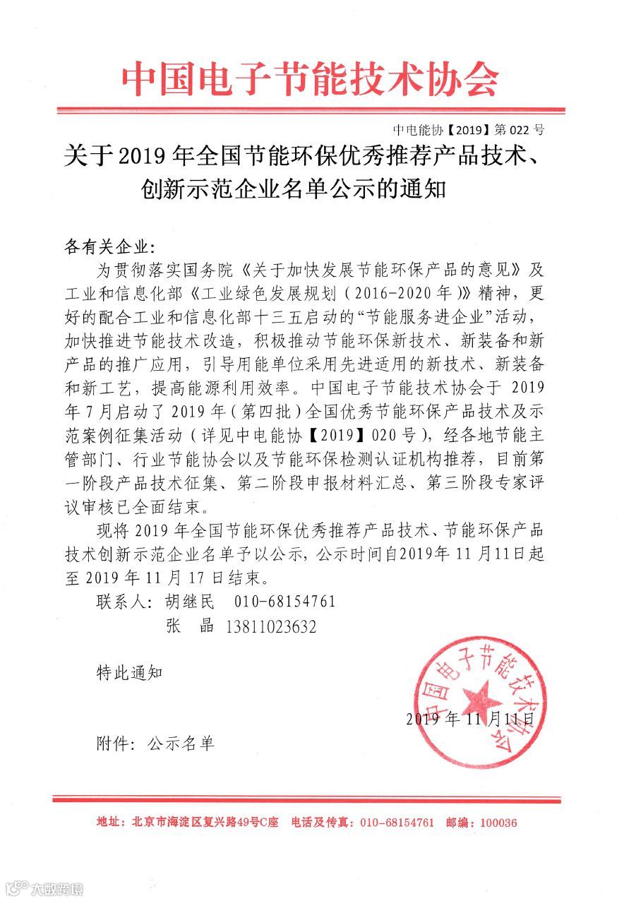 通过2019年(第四批)全国优秀节能环保产品技术评审。